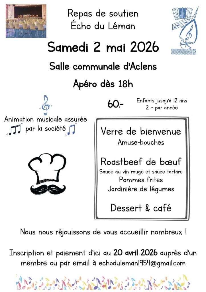 2.5.26 Echo Du Léman : Repas de soutien Le FAR 9 mars 2026 Actus Membres No Comment Echo du Léman : Repas de soutien L’ECHO DU LEMAN organise le samedi 2 mai 2026 dès 18h dans la salle communale d’Aclens un repas de soutien.Plus de détails sur le flyer ci-après.Sur inscription jusqu’au 20 avril : Fr. 60.-/personne Google maps Flyer Tags: 2604, Accordéon, Salle communale Aclens