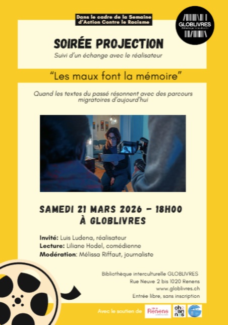 Cette soirée aura lieu le samedi 21 mars à 18h dans les locaux de Globlivres avec la projection de capsules vidéo de personnes racontant leur parcours de migration. En début de soirée, Liliane Hodel, comédienne, lira les textes donnés aux protagonistes pour amorcer leur témoignage. La projection sera suivie d’une discussion menée par Mélissa Riffaut, journaliste, en présence de Luis Ludena, initiateur de ce projet intitulé “Les maux font la mémoire“.