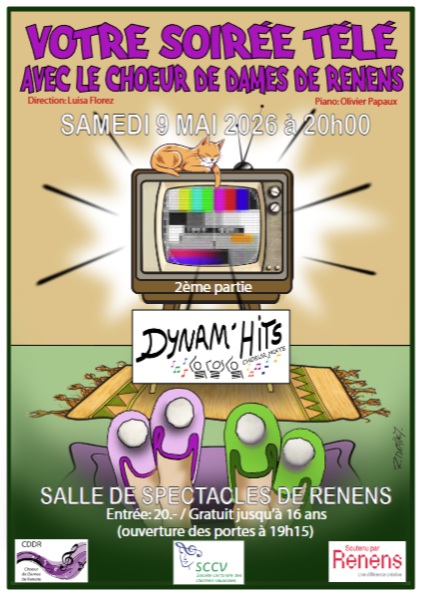 9.05.26 CDDR – Soirée télé Le FAR 6 avril 2026 Actus Membres No Comment CHOEUR DE DAMES DE RENENS L’association Chœur de Dames de Renens organise le 9 mai 2026 à 20h dans la salle de spectacle de Renens sa soirée annuelle “TELE”. Venez nombreux !Entrée Fr. 20.- , gratuit jusqu’à 16ansOuverture des portes 19h15 Flyer Tags: Chœur de Dames de Renens, Renens, Salle de spectacles Renens